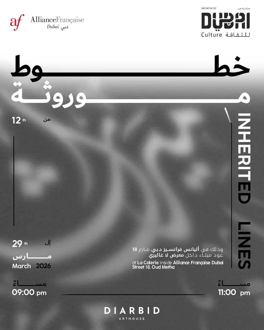 You are warmly invited to the opening of Inherited Lines on 12 March from 9:00 to 11:00 PM. The exhibition will be on view until 29 March. an exhibition exploring Arabic calligraphy as both visual language and spatial harmony, where symmetry moves from text to space. Organized on the occasion of the Holy Month of Ramadan, the exhibition is presented by Dubai Culture & Arts Authority in collaboration with Alliance Française Dubai, the French cultural centre operating under the sponsorship of the French Consulate in Dubai, and curated and coordinated by DiarBid ArtHouse. Inherited Lines features a curated selection of works by DiarBid calligraphy artists, established professional calligraphers and instructors, alongside selected pieces by students from last year’s Arabic Calligraphy Program led by Dubai Culture & Arts Authority.